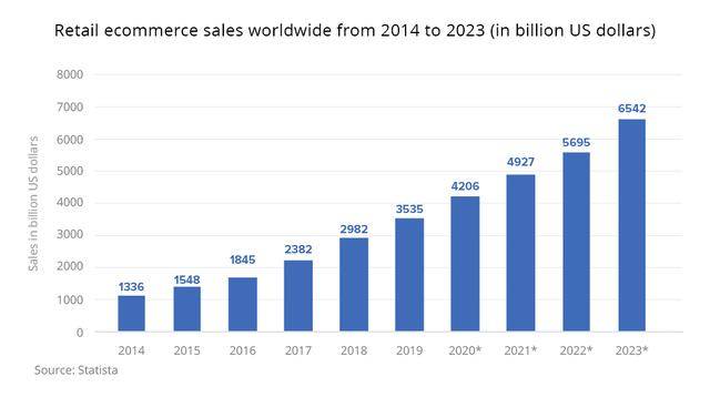 网购人数增加带来的直接效应是电子零售额的增长。Statista预计2021年电子商务市场价值将达到4.93万亿美元,全球在线销售额将占零售总额的22%。而在2022年,全球电子零售总额将涨至5.69万亿美元。纳斯达克预计,到2040年,95%的消费者可能都会选择网上购物。