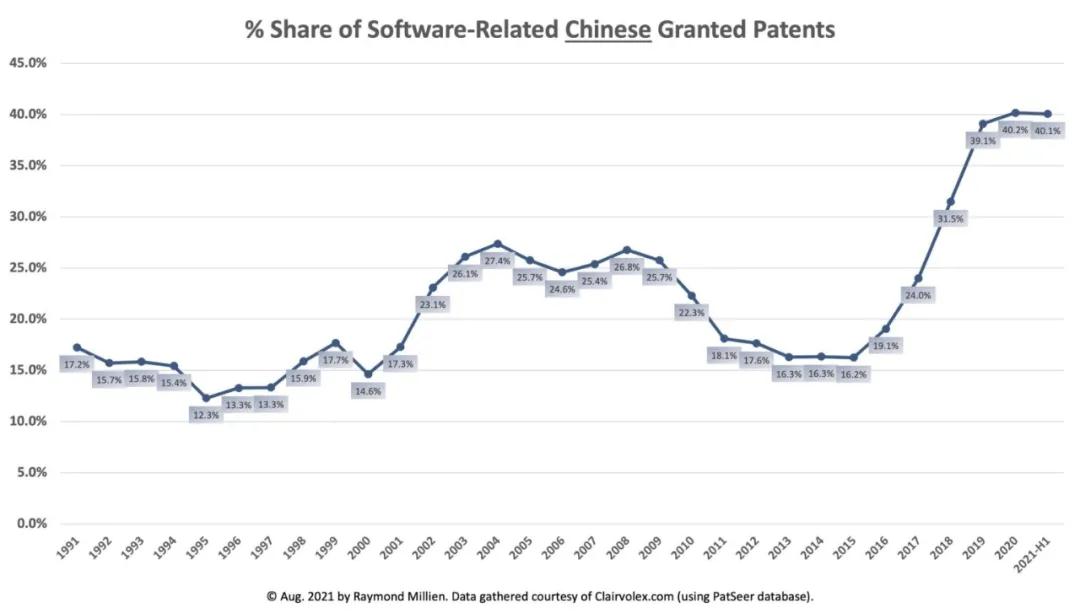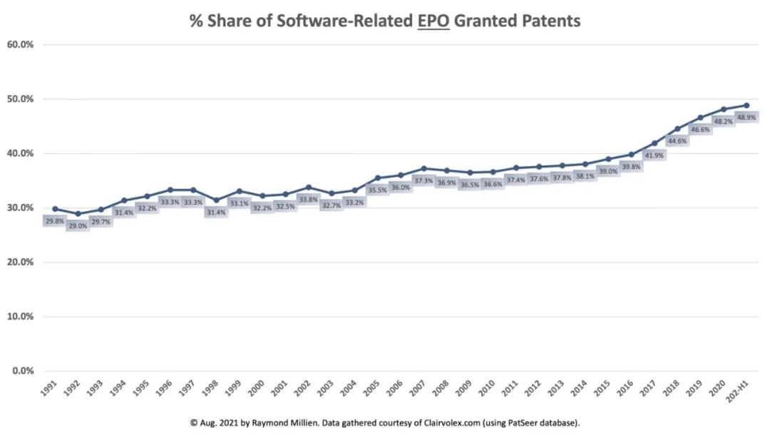 原文标题:In First Half of 2021, 63% of U.S. Patents, 48.9% at EPO and 40.1% in China Were Software-Related