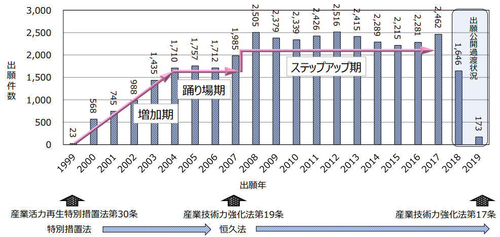 在第三阶段,“日本拜杜”条款作为《产业技术强化法》第19条,从特别措施法改为永久法(2007年8月6日执行),此后,专利申请数量又上了一个台阶,近年的申请量为每年约2200至2500件申请。其中,上升期(1999-2004),日本国内商业公司(下称“公司”)的专利申请影响较大;平缓期(2004-2007)和加强期(2007至今),高等教育机构的专利申请影响较大。