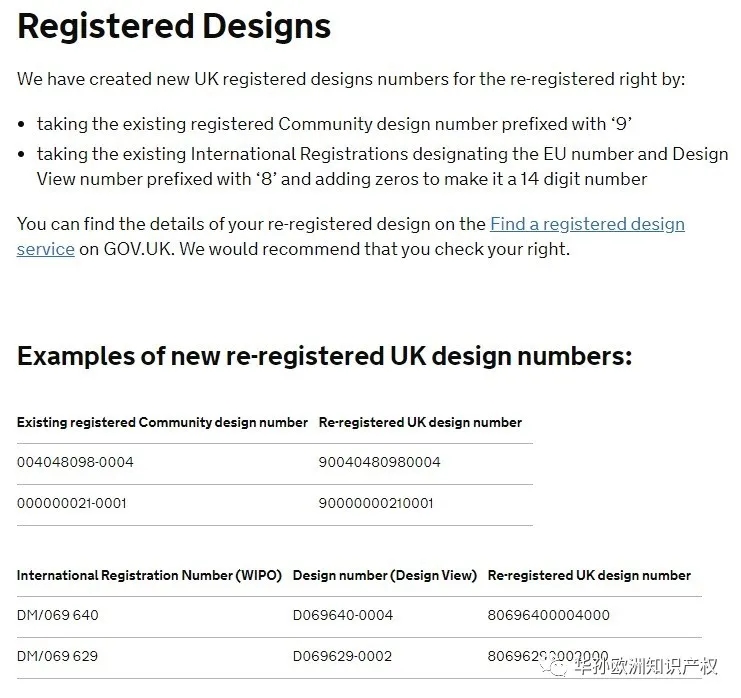如下图所示,英国知识产权局为Comparable UK trade mark和re-registered UK design设立了下述编号规则,并举例说明如下: